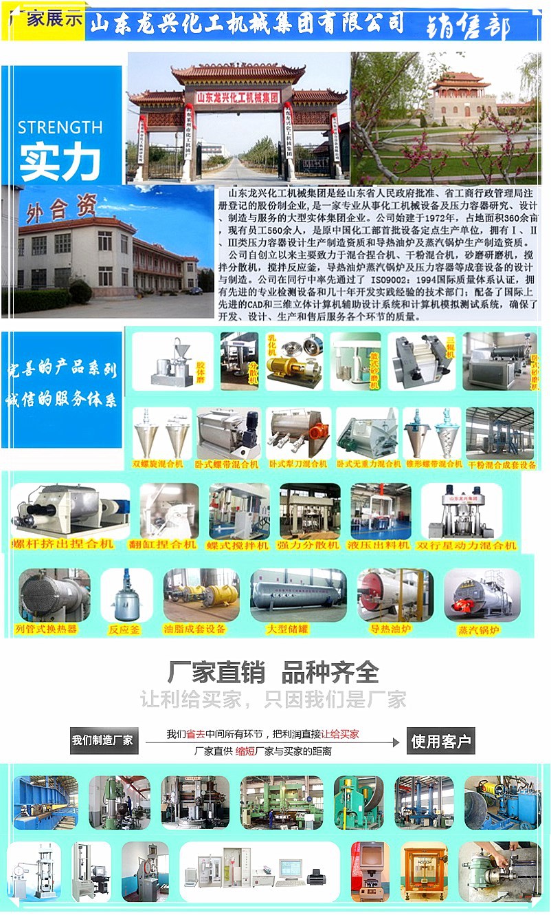 山東龍興化工機械集團憑借在業(yè)內(nèi)三十多年的技術(shù)積累和成長經(jīng)歷,已經(jīng)發(fā)展為集科研、開發(fā)、制造為一體的科技型集團公司,主要業(yè)務涉及液體研磨機、攪拌分散機,膏體混拌捏合機、雙行星動力攪拌混合機,干粉攪拌混合機,導熱油、蒸汽鍋爐、低溫容器及反應釜罐和換熱器及一二三類壓力容器的設(shè)計與生產(chǎn)。同時我們承接行業(yè)用戶成套設(shè)備及生產(chǎn)線的設(shè)計制造業(yè)務,龍興人愿與天下有識之士攜手共創(chuàng)新的輝煌。
